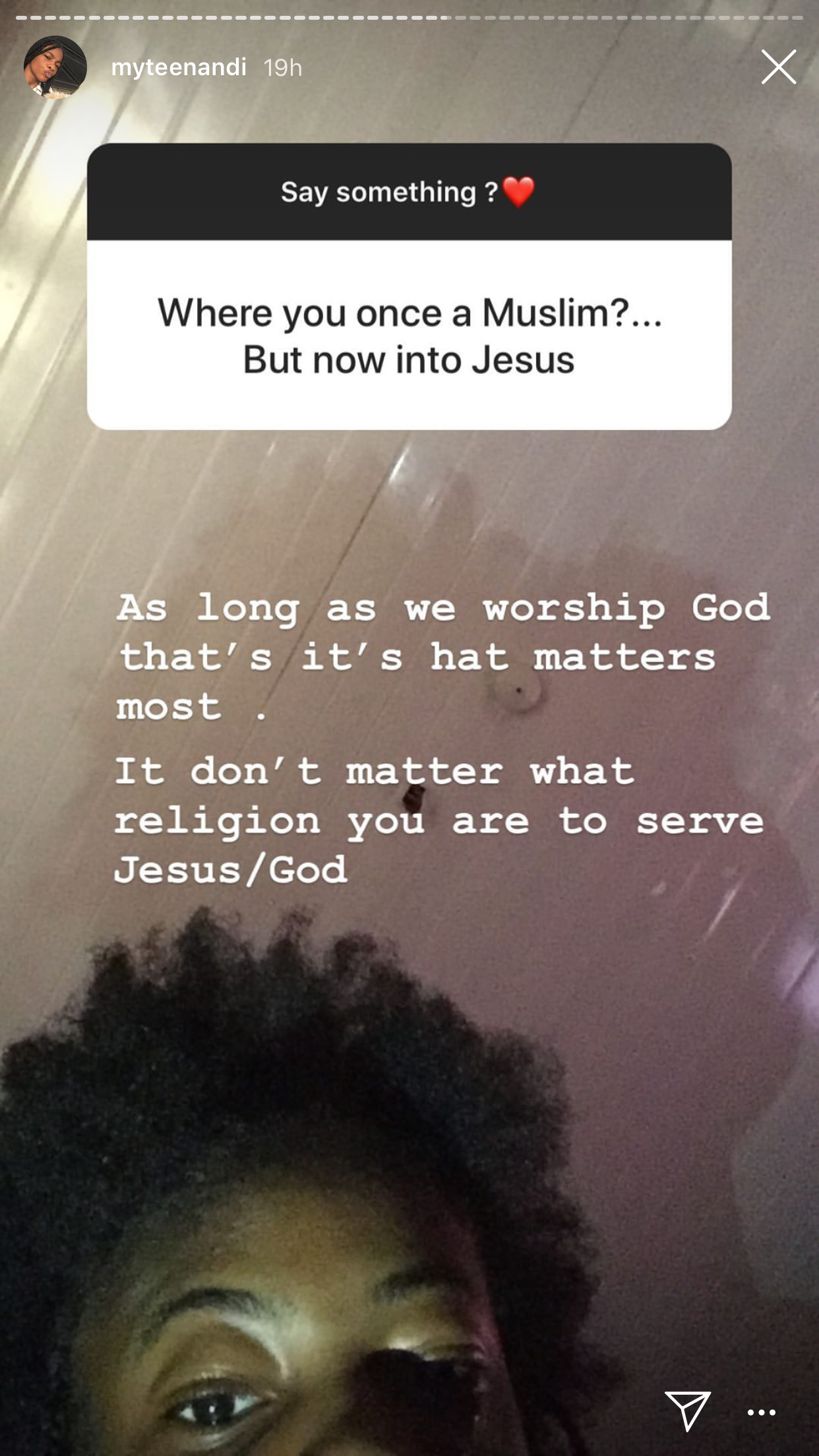 “Honestly I don’t understand that question and in my opinion . I believe that we all serve one God ! And as long as we abide by his words then that’s the key. So religion doesn’t really have a factor.”